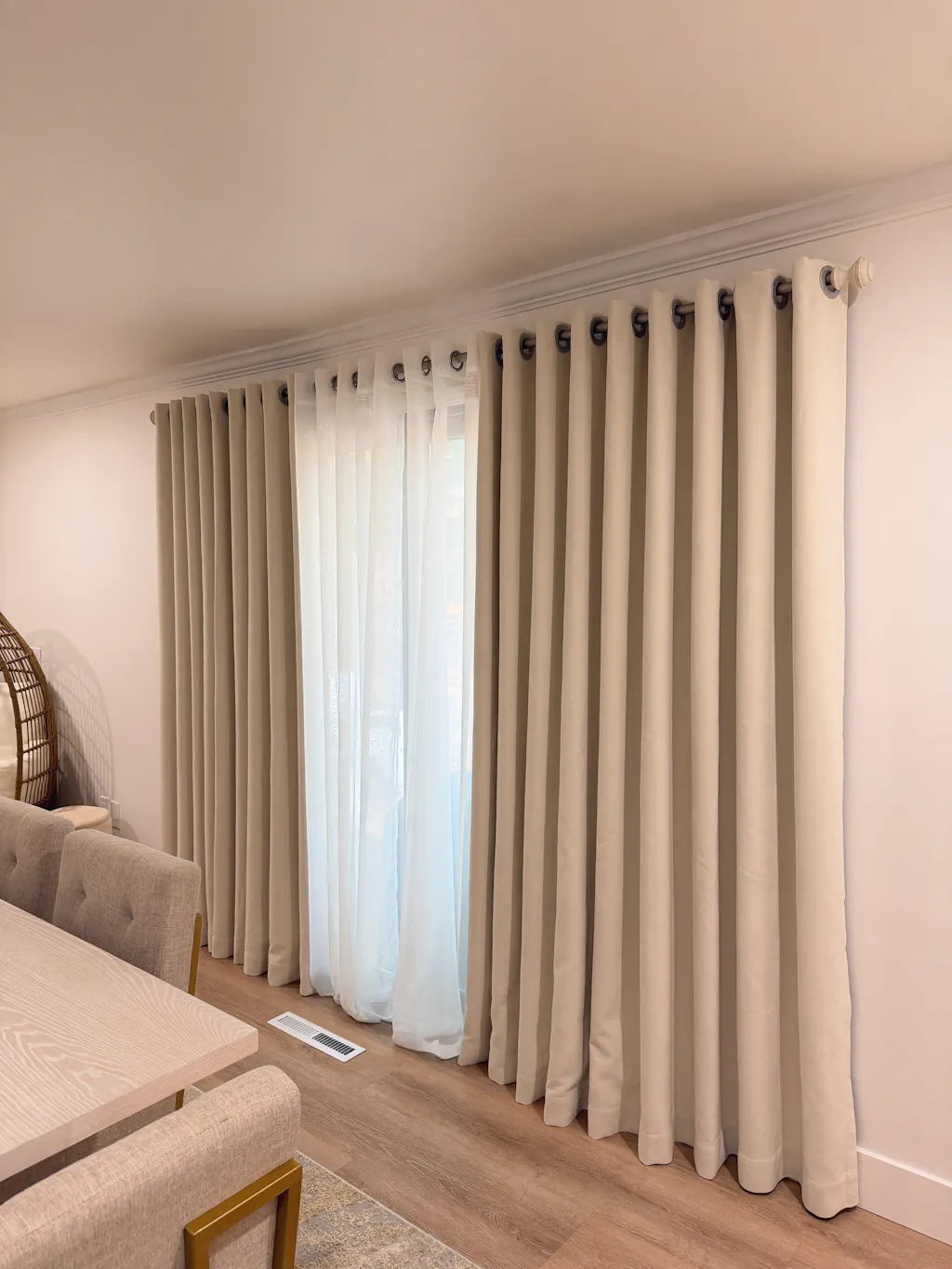 Except for the sheer curtains, we use high-temperature setting for every curtain. Memory Shape Training Curtain Technology enables the fabric to retain a crisp vertical line from ceiling to floor. After being shaped by body memory, your drapes will hang straight, featuring beautiful folds and no flaring at the bottom. This is unlike regular curtain fabrics, which often lose their shape towards the bottom